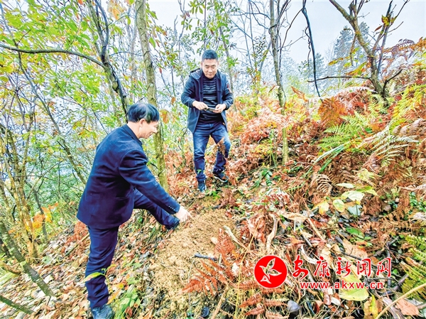 郭光均(左)在查看林下種植的天麻。