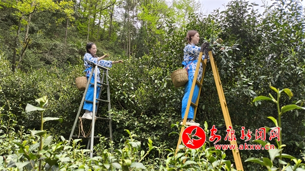 4月28日,安康市紫陽縣雙橋鎮(zhèn)蓮花村村民正搭著梯子,采摘古茶樹鮮葉。通訊員 儲茂銀攝