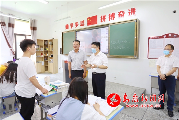 在漢濱高中, 寇全安一行先后檢查了入校檢測點、防疫物資儲備、監(jiān)控平臺運行等,了解考點參考人數(shù)、考場布置,以及食品安全、試卷保密等備考保障措施落實情況,叮囑要壓實各方責任,加強統(tǒng)籌配合,為廣大考生營造安全安靜、舒適舒心的考試環(huán)境。在江北高中和漢陰縣第二中學,他走進教室和高考學子交談,勉勵他們保持良好心態(tài),從容備考應考,并祝福考生取得優(yōu)異成績;還著重了解了學校心理咨詢室運行情況,并就如何開展心理健康教育和預防校園暴力與校長、部分教師進行了交流探討。