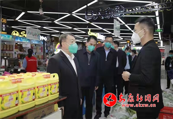 武文罡一行在紫陽縣城關(guān)鎮(zhèn)會仙橋社區(qū)萬友超市檢查生活物資供應(yīng)情況。記者 吳單 攝RZE安康新聞網(wǎng)