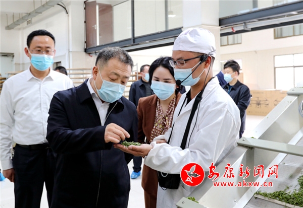 市長武文罡(左二)在長安鎮(zhèn)田珍茶業(yè)調(diào)研茶葉生產(chǎn)加工情況(攝影:李世鋒)8qT安康新聞網(wǎng)