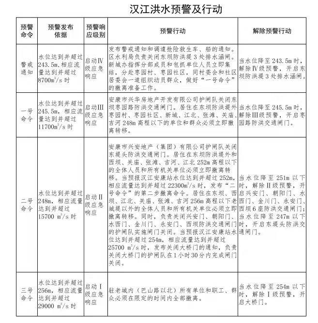 根據(jù)《安康市人民政府關(guān)于印發(fā)安康城區(qū)防汛抗洪預(yù)案的通知》有關(guān)漢江洪水預(yù)警及行動的內(nèi)容:URn安康新聞網(wǎng)