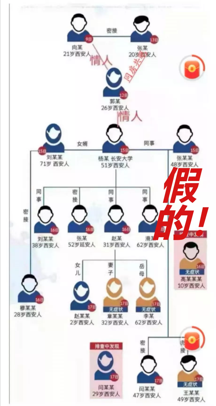 網(wǎng)上流傳一張確認(rèn)病例傳播鏈分解圖,在病例之間標(biāo)注“情人”關(guān)系,并傳言此次疫情傳播因素之一,是因?yàn)槲靼彩桌±c子牛門診的護(hù)士為情人關(guān)系,導(dǎo)致疫情擴(kuò)散,經(jīng)核實(shí),該圖盜用華商網(wǎng)12月18日制作的新聞作品圖片。該信息為虛假信息,造謠的人已被拘留。ZVg安康新聞網(wǎng)