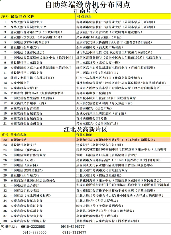 為進(jìn)一步方便廣大用戶購買天然氣,我公司在電信營業(yè)廳、建設(shè)銀行、農(nóng)商銀行及便民服務(wù)點(diǎn)等網(wǎng)點(diǎn)布設(shè)38臺天然氣自助終端繳費(fèi)機(jī),F(xiàn)溫馨提示您關(guān)注“安康市逸華天然氣有限公司”微信公眾號查看自助機(jī)分布網(wǎng)點(diǎn),選擇就近網(wǎng)點(diǎn)進(jìn)行天然氣充值。其他業(yè)務(wù)可在工作時(shí)間內(nèi)前往以下人工服務(wù)大廳或窗口辦理,部分業(yè)務(wù)也可通過微信公眾號的“微營業(yè)廳”辦理: