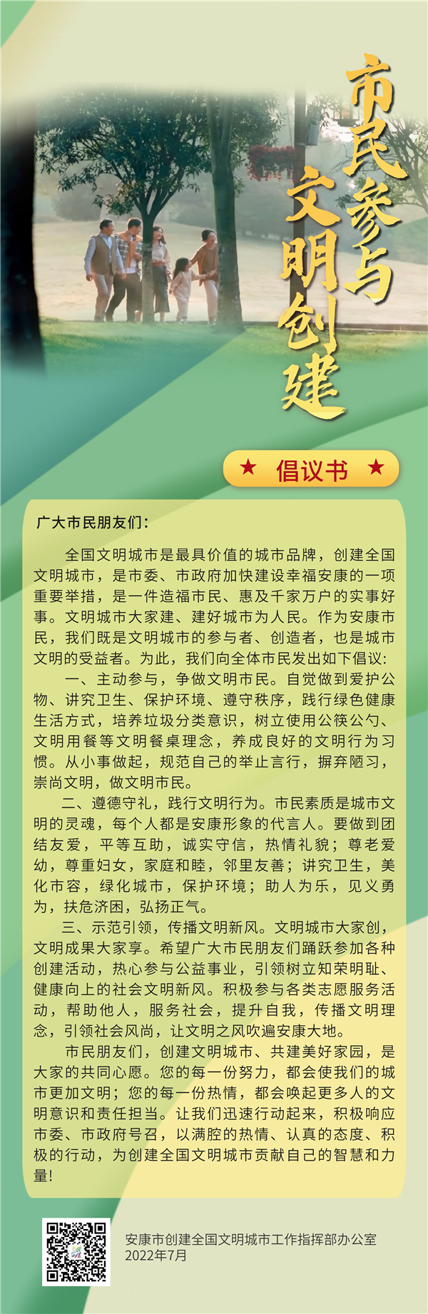 全國(guó)文明城市是最具價(jià)值的城市品牌,創(chuàng)建全國(guó)文明城市,是市委、市政府加快建設(shè)幸福安康的一項(xiàng)重要舉措,是一件造福市民、惠及千家萬(wàn)戶的實(shí)事好事。文明城市大家建、建好城市為人民。作為安康市民,我們既是文明城市的參與者、創(chuàng)造者,也是城市文明的受益者。為此,我們向全體市民發(fā)出如下倡議:  cwA安康新聞網(wǎng)