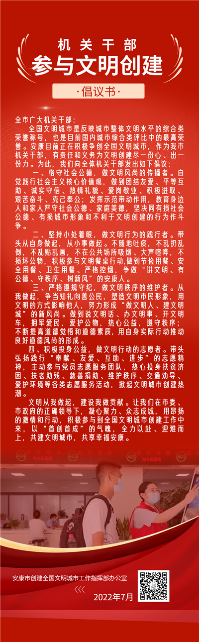 全國文明城市是反映城市整體文明水平的綜合類榮譽稱號,也是目前國內城市綜合類評比中的最高榮譽。安康目前正在積極爭創(chuàng)全國文明城市,作為我市機關干部,有責任和義務為文明創(chuàng)建盡一份心、出一份力。為此,我們向全體機關干部發(fā)出如下倡議:iNc安康新聞網(wǎng)