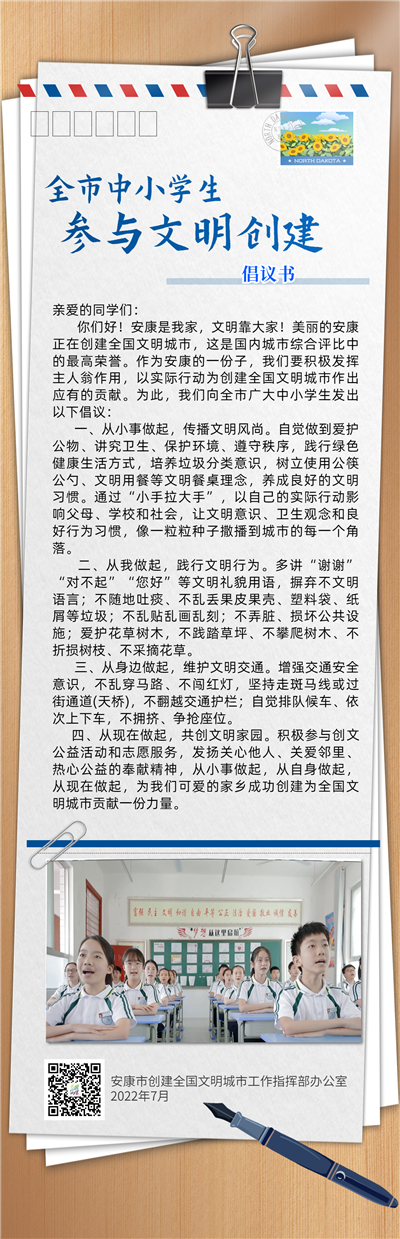 你們好!安康是我家,文明靠大家!美麗的安康正在創(chuàng)建全國文明城市,這是國內城市綜合評比中的最高榮譽。作為安康的一份子,我們要積極發(fā)揮主人翁作用,以實際行動為創(chuàng)建全國文明城市作出應有的貢獻。為此,我們向全市廣大中小學生發(fā)出以下倡議:wUY安康新聞網(wǎng)