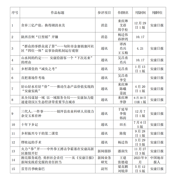 經(jīng)過1月30日編委會推薦、社黨委研究決定,擬推薦以下15件新聞作品參評2023年度“陜西新聞獎”。公示時間從2024年1月31日至2024年2月5日,公示期為5個工作日。如有不同意見,請向安康日報社機關(guān)紀委、新聞管理部反映。Fb5安康新聞網(wǎng)