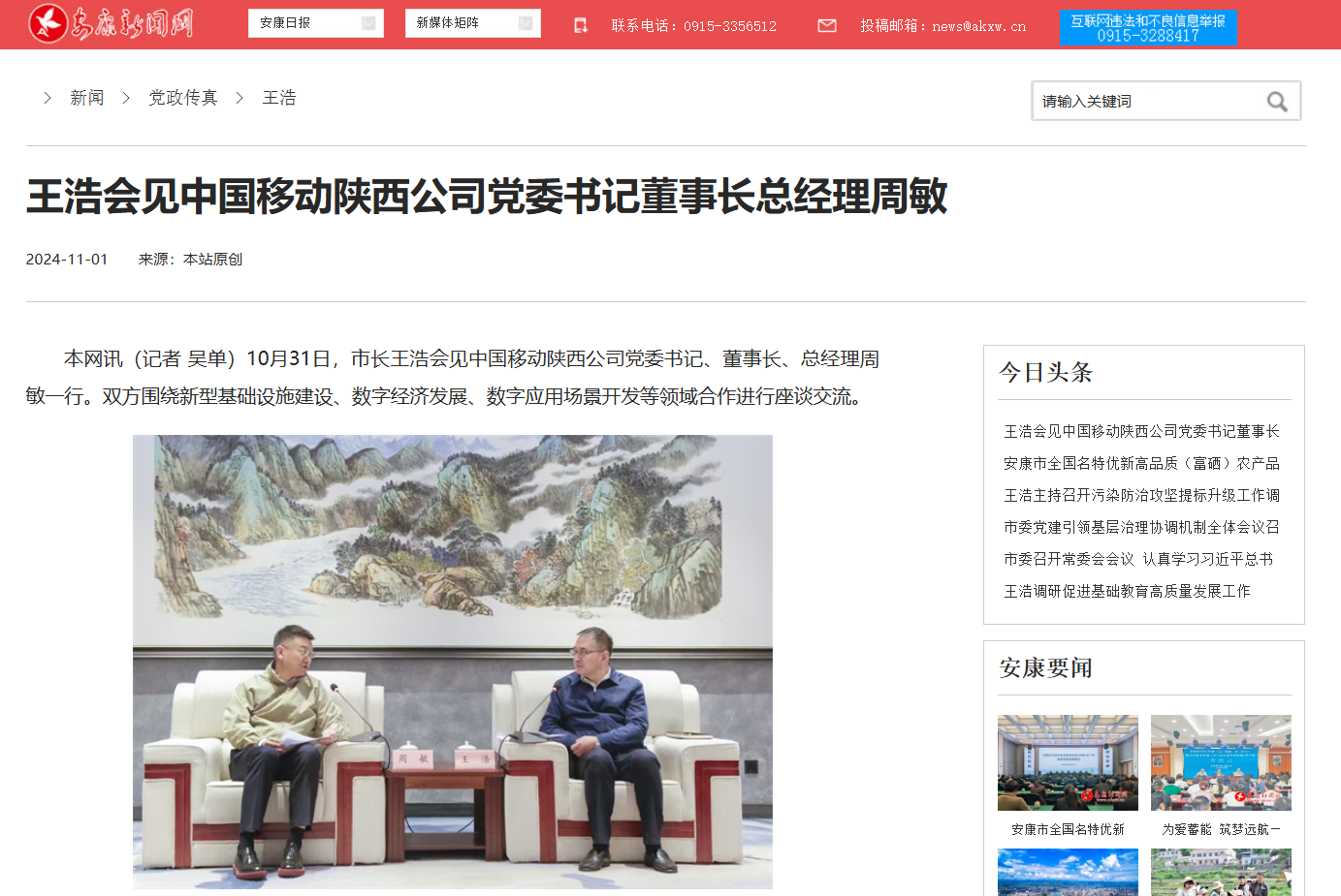 《王浩會見中國移動(dòng)陜西公司黨委書記董事長總經(jīng)理周敏》(2024-11-01發(fā)布)x9P安康新聞網(wǎng)