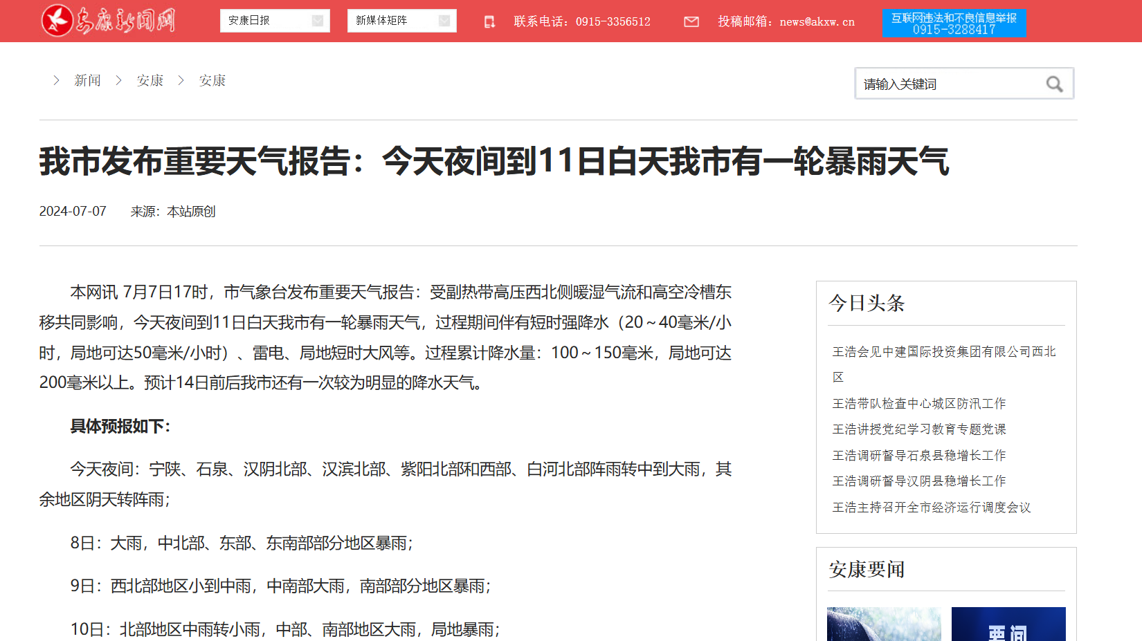 《我市發(fā)布重要天氣報(bào)告:今天夜間到11日白天我市有一輪暴雨天氣》(2024-07-07發(fā)布)x9P安康新聞網(wǎng)