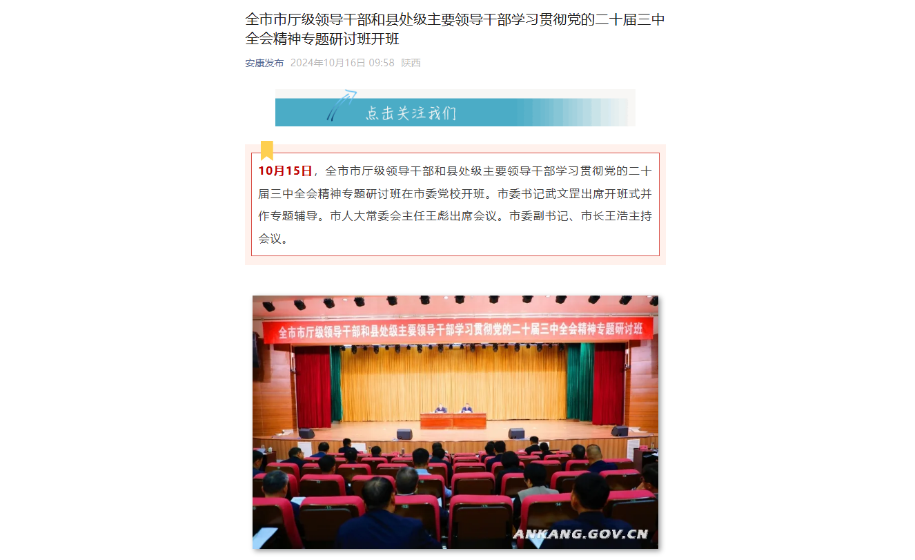 《全市市廳級領(lǐng)導(dǎo)干部和縣處級主要領(lǐng)導(dǎo)干部學(xué)習(xí)貫徹黨的二十屆三中全會精神專題研討班開班》(2024-10-16發(fā)布于安康發(fā)布公眾號)x9P安康新聞網(wǎng)
