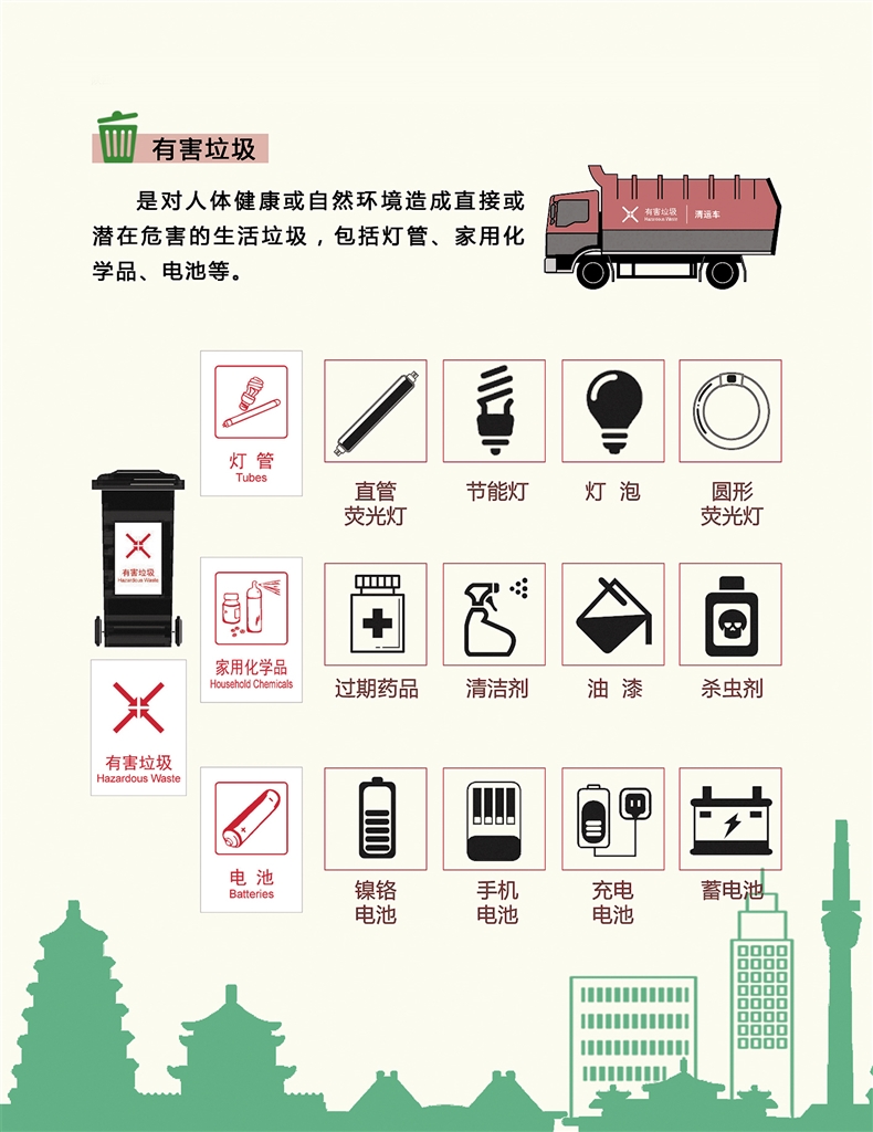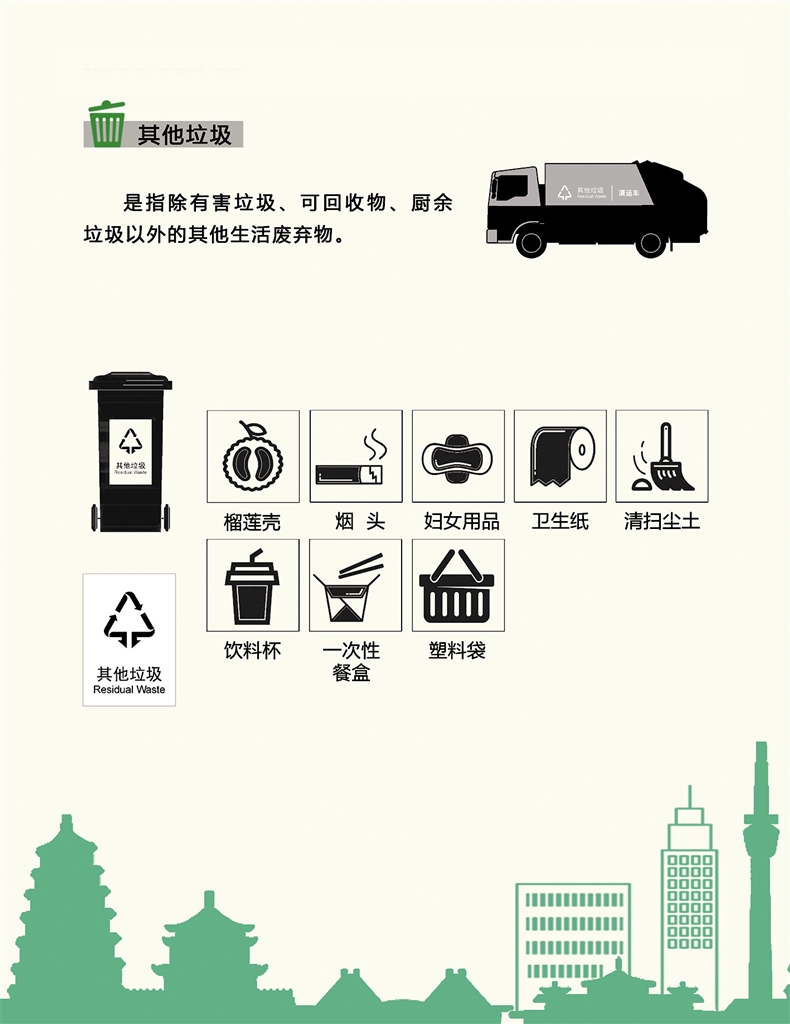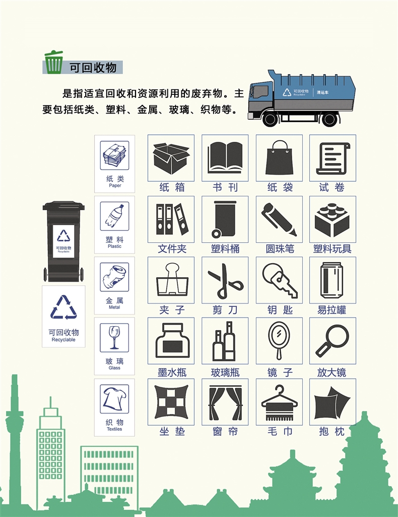 垃圾可以分為可回收垃圾、廚余垃圾、有害垃圾和其他垃圾四類。可回收垃圾主要包括廢紙、塑料、玻璃、金屬和布料五大類;廚余垃圾包括剩菜剩飯、骨頭、菜根菜葉、果皮等食品類廢物;有害垃圾包括廢電池、廢日光燈管、廢水銀溫度計(jì)、過(guò)期藥品等,這些垃圾需要特殊安全處理;其他垃圾包括除上述幾類垃圾之外的磚瓦陶瓷、渣土、衛(wèi)生間廢紙、紙巾等難以回收的廢棄物,采取衛(wèi)生填埋可有效減少對(duì)地下水、地表水、土壤及空氣的污染。