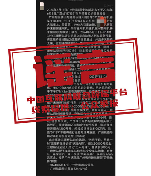 辟謠:網(wǎng)傳“廣州鐵路局安監(jiān)部2024年6月5日廣茂線57139列車傾覆初步調(diào)查報告”為虛假信息