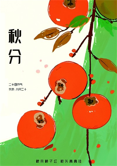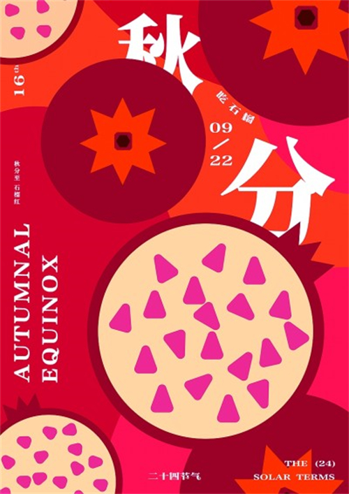 秋分到,柿子紅。柿子又稱“朱果”,立秋之后的柿子更加甜美可口。圖①作品取柿子的吉祥寓意,刻畫了一幅秋柿高掛枝頭的場景,成熟的柿子飽滿而有光澤,看起來非常吸引人。圖②則以“秋分吃石榴”為主題展開創(chuàng)作,將俯視的石榴與切開的石榴圖形化,通過形狀的大小對比以及色塊的明度變化,增加了海報的視覺層次感和前后縱深感,使單一元素變得豐富;在色彩選擇上,通過暗紅色與淡黃色的對比,帶來了比較跳躍的視覺體驗。