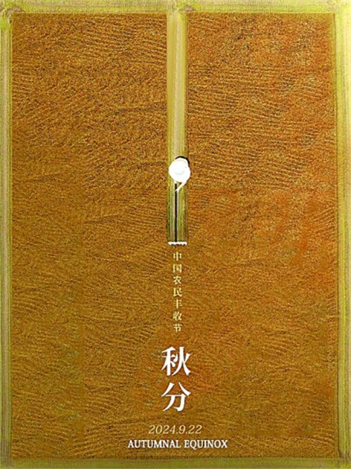 秋分時節(jié),是農(nóng)作物豐收的重要季節(jié),田間地頭一派農(nóng)忙景象。自2018年起,我國將每年秋分設立為“中國農(nóng)民豐收節(jié)”,圖④作品即聚焦這一主題,整體采用俯視角度,畫面中央一名農(nóng)民正在稻田中勞動,稻田的金黃顏色象征著豐收與希望,充滿視覺沖擊力,展現(xiàn)出大地滿載收獲的美好景象。