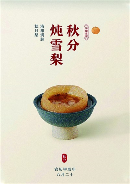 秋風漸起,寒涼氣息加重。秋分時節(jié)在飲食調(diào)養(yǎng)方面,應多喝水,吃清潤的食物。圖⑦設計的中心元素是冰糖燉雪梨,象征秋季的清潤與養(yǎng)生,也暗示了秋分時節(jié)陰陽調(diào)和、天地平衡的自然哲理。