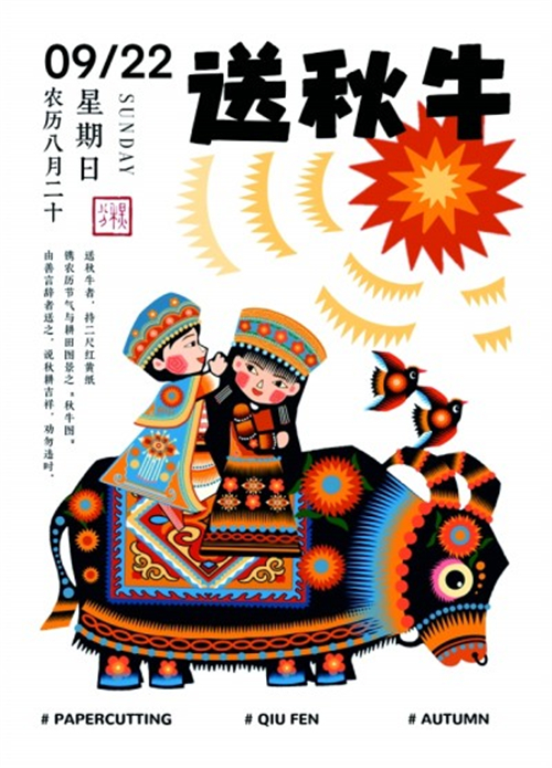 秋分是一個重要的農(nóng)業(yè)節(jié)氣,也是中國傳統(tǒng)文化中的重要時刻,民間很重視秋分節(jié)氣,有著各種秋分習俗。例如“送秋牛”,一般在紅紙或黃紙上畫農(nóng)夫耕田圖樣,再印上全年農(nóng)歷節(jié)氣情況,送圖者都是些民間善言唱者,主要說些秋耕吉祥、不違農(nóng)時的話。圖③借用工藝美術家?guī)焓缣m的剪紙作品形式,將其基本圖形進行組合再創(chuàng)作,配色選用橙黃為主、藍色為輔,顯得既貼近傳統(tǒng),又生動有趣。