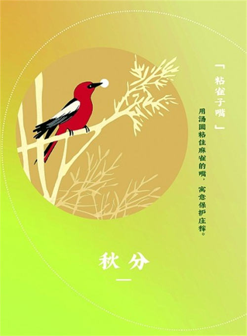 秋分的另一個有趣習俗是“粘雀子嘴”,即用一些沒有餡兒的糯米團子,以竹簽串好插在田間地頭,喂食給鳥雀,寓意“粘住麻雀的嘴”,以保護莊稼、確保糧食收成。圖⑤作品采用橙黃和黃綠色調(diào),營造出秋日的溫暖氛圍;海報中央的圓形圖案框是湯圓的抽象再現(xiàn),圓框內(nèi)麻雀站在枝頭,嘴中叼著軟糯的湯圓,形象地展現(xiàn)了“粘雀子嘴”的習俗。