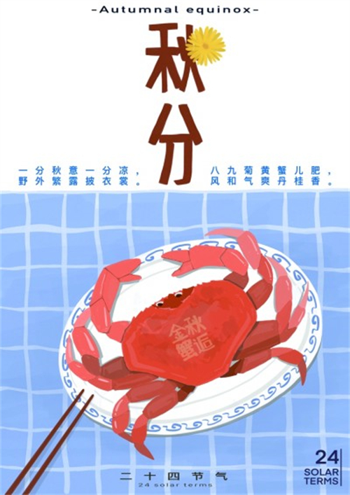 “秋風起,蟹腳癢,菊花開,聞蟹來。”把酒持螯,真可謂一件樂事。圖⑥畫面中央的大閘蟹紅艷誘人,寓意豐收與團圓;白色盤子與藍色格子桌布相映成趣,增添節(jié)日溫馨感;黃色的菊花與“秋分”字樣相襯,融合了中國傳統(tǒng)元素與現(xiàn)代審美,傳遞出濃厚的秋分節(jié)氣氛圍。