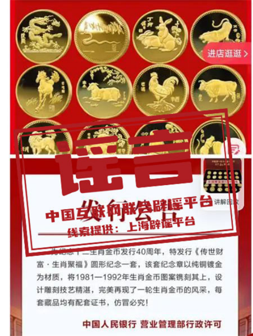 真相:“為紀(jì)念十二生肖金幣發(fā)行40周年,特發(fā)行《傳世財富·生肖聚福》圓形紀(jì)念章一套”“一次性收齊央行十二生肖紀(jì)念幣”……直播間里的各種“紀(jì)念幣”,有的甚至帶有“央行發(fā)行公告”等“紅頭文件”,讓人真假難辨。經(jīng)上海網(wǎng)信部門調(diào)查發(fā)現(xiàn),上述網(wǎng)傳商品與央行發(fā)行的紀(jì)念幣有著天壤之別。很多商家故意混淆“紀(jì)念章”與“紀(jì)念幣”、“央行圖樣許可”與“央行發(fā)行”的區(qū)別,誤導(dǎo)公眾。事實上,“紀(jì)念幣”由央行發(fā)行,分為普通紀(jì)念幣與貴金屬紀(jì)念幣,“紀(jì)念章”則是商家自行設(shè)計制造的,與央行沒有關(guān)系;而“圖樣行政許可”只是表示央行同意相關(guān)單位在產(chǎn)品上使用人民幣圖樣,并不代表產(chǎn)品由央行發(fā)行。對公眾來說,想要分辨是“央行發(fā)行”還是“商家生產(chǎn)”,一是可以通過央行官網(wǎng)查看每年發(fā)行的普通紀(jì)念幣和貴金屬紀(jì)念幣項目;二是看紀(jì)念幣或紀(jì)念鈔是否有面額和貨幣單位,其中貨幣單位為“元”。(來源:“上海網(wǎng)絡(luò)辟謠”微信公眾號)