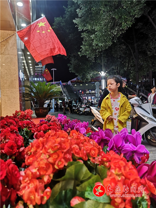 9月30日晚,興安路金州路十字某商家用國(guó)慶和鮮花裝飾店面,引得市民駐足。