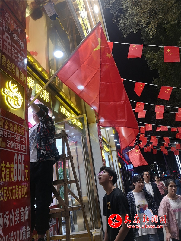 9月30日晚,金州路某商家正在為店面掛國(guó)旗。
