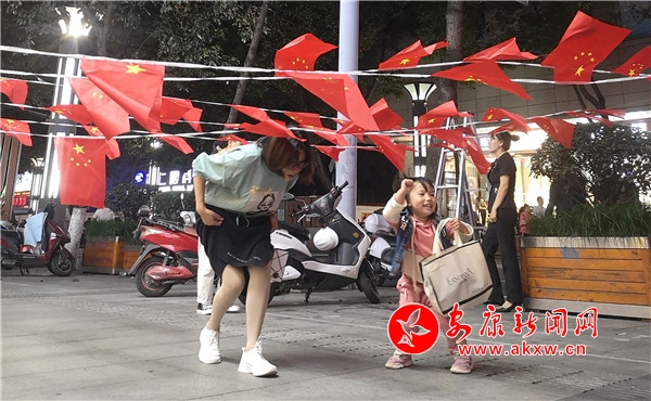 9月30日晚,興安中路某商家正在為店面掛國(guó)旗。