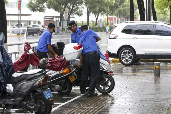 2022年7月19日,漢濱城管分局新城執(zhí)法大隊(duì)的執(zhí)法人員,冒著小到中雨,沿著巴山東路清理整頓占道經(jīng)營(yíng)和亂停亂放等不良行為。(李元武)ej3安康新聞網(wǎng)