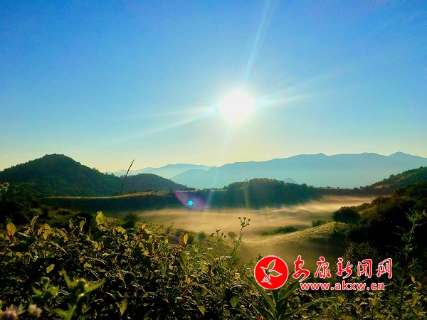 初陽(yáng)下,萬道金光里,襯托著天邊露白,云霧徘徊山巒之間久久不散。iYr安康新聞網(wǎng)