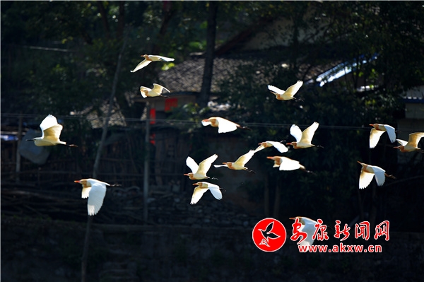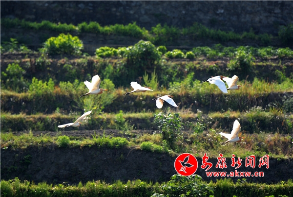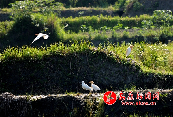 石泉城關(guān)鎮(zhèn)生態(tài)環(huán)境持續(xù)向好,在絲銀壩村草池灣翻耕過的農(nóng)田里,30余只牛背鷺時(shí)而展翅,時(shí)而降落,盡情嬉戲玩耍,撒歡覓食。(圖文/董長松)YSF安康新聞網(wǎng)