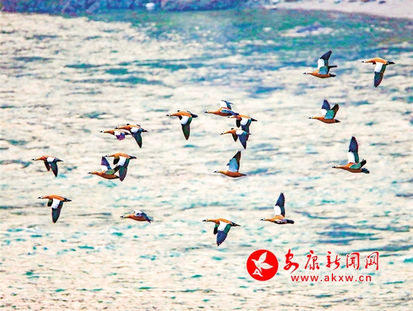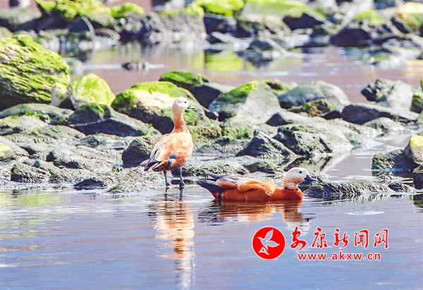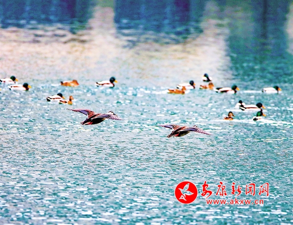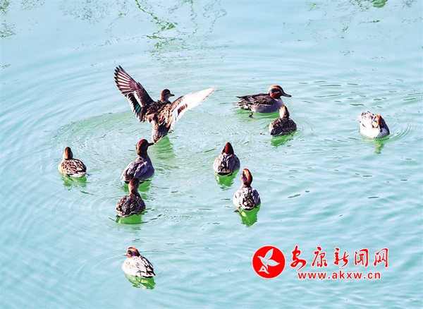 通過攝影鏡頭觀察發(fā)現(xiàn),在大片野鴨群中有綠頭鴨、斑嘴鴨、赤麻鴨等數(shù)10個種類。它們在這里和諧相處,像一個個小精靈悠閑自得。一群群野鴨在河里時而相互追逐,時而潛水覓食,一會兒游上岸邊休息,一會兒展翅飛翔劃過湛藍的天空,一幅人與自然和諧共生的美麗畫卷在石泉徐徐展開。