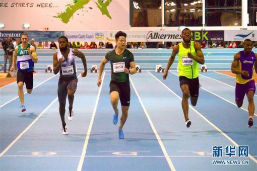 ↑2月13日,中國選手蘇炳添(中)在預賽中沖刺。 當日,在愛爾蘭阿斯隆舉行的室內(nèi)大獎賽中,中國短跑名將蘇炳添以6秒52的成績在男子60米比賽中奪冠并打破賽會紀……