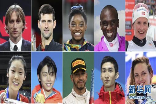 新華社體育部評(píng)出2018年國(guó)際十佳運(yùn)動(dòng)員。拼版照片上排從左至右為:盧卡·莫德里奇、諾瓦克·焦科維奇、西蒙·拜爾斯、埃魯?shù)隆せ諉谈、比約根;下排從左至右……