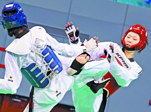 張夢(mèng)宇(右)在跆拳道女子67公斤級(jí)為廣東代表團(tuán)再添一金。新華社記者 郭晨 攝XTb安康新聞網(wǎng)