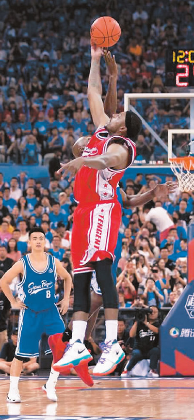 9月10日晚,上海東方體育中心。在現(xiàn)場(chǎng)1.2萬余名觀眾的吶喊中,參加2017超級(jí)企鵝籃球名人賽的紅藍(lán)兩隊(duì)上演激烈對(duì)抗。gX8安康新聞網(wǎng)
