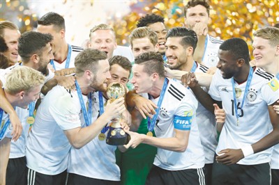 | 7月2日,俄羅斯圣彼得堡舉行的2017年聯(lián)合會(huì)杯足球賽決賽中,德國隊(duì)以1∶0戰(zhàn)勝智利隊(duì),奪得冠軍。德國隊(duì)球員在頒獎(jiǎng)儀式上捧杯慶祝。 |