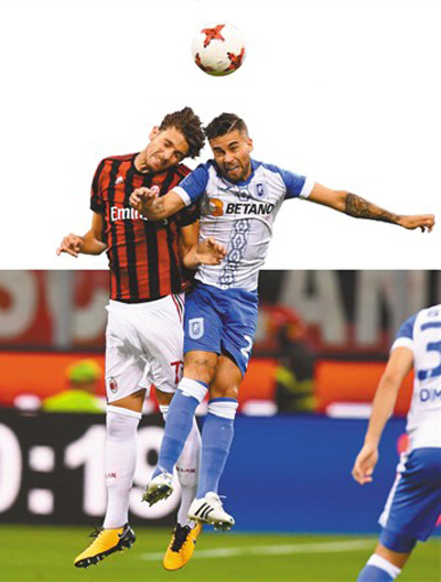 | 8月3日,在意大利米蘭進(jìn)行的歐聯(lián)杯資格賽第三輪次回合比賽中,意甲AC米蘭隊(duì)主場以2∶0戰(zhàn)勝羅馬尼亞克拉約瓦大學(xué)隊(duì)。圖為兩隊(duì)球員在拼搶。 |