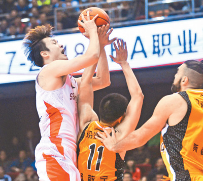 10月29日,山東隊球員丁彥雨航(左一)在比賽中上籃。