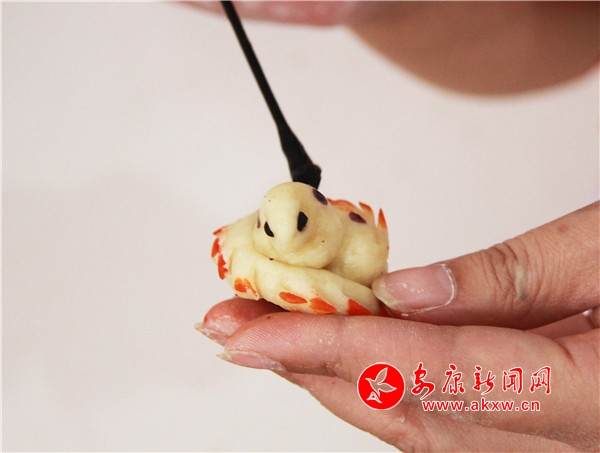 “做花饃先要做饃盤(基座),饃盤可大可小,一般有兩個饅頭大,然后將發(fā)酵好的面團用手捏、用剪刀剪成各種花兒和鳥兒等圖案作為饃頂,如果面太軟,或者圖案太大,還需要用牙簽或者較大的竹枝從饃頂部插到饃盤上,以便固定不變形,最后放在籠屜上,蓋鍋后用大火蒸,待出鍋即成為造型生動的花饃。最后再進行上色,花饃形狀最多的是喜鵲、龍、鯉魚等,造型喜慶寓意吉祥。” 花饃技藝傳承人胡志霞說道。kQr安康新聞網(wǎng)