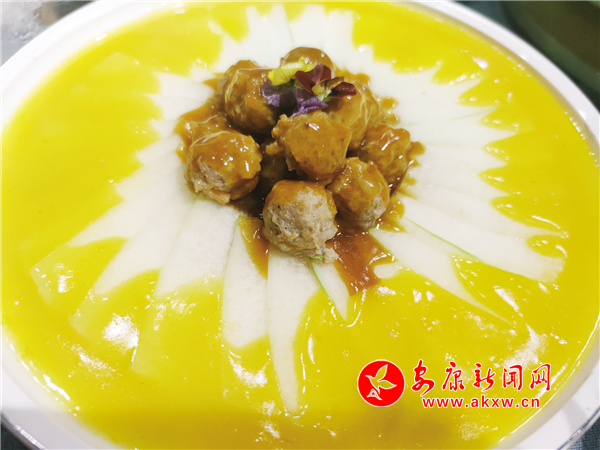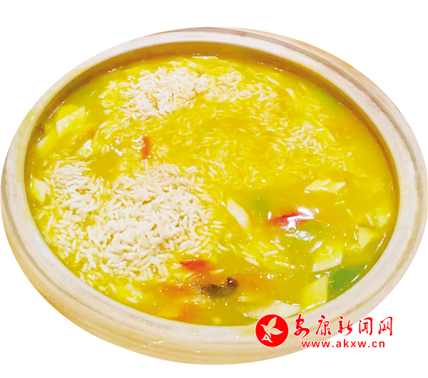 這是一道舌尖美味,制作時提前把海參、青筍、杏鮑菇、紅蘿卜切好汆水,備好墨魚花、蝦仁、棒骨高湯、南瓜泥、咸蛋黃,炸好香米,客人餐前,把炸好的香米復(fù)炸香脆裝盤,再把雞油、咸蛋黃、高湯和南瓜泥放入鍋內(nèi)翻炒,然后倒入海參、青筍、杏鮑菇、紅蘿卜、墨魚花、蝦仁等食材,燒開勾芡,調(diào)制成濃香金湯,起鍋裝盆,端到客人餐桌,當(dāng)著食客的面將脆米倒入盛裝金湯的土盆里,攪拌均勻即可。這道菜看著五顏六色、金黃油亮,吃著養(yǎng)胃養(yǎng)顏,湯汁鮮美,營養(yǎng)豐富。