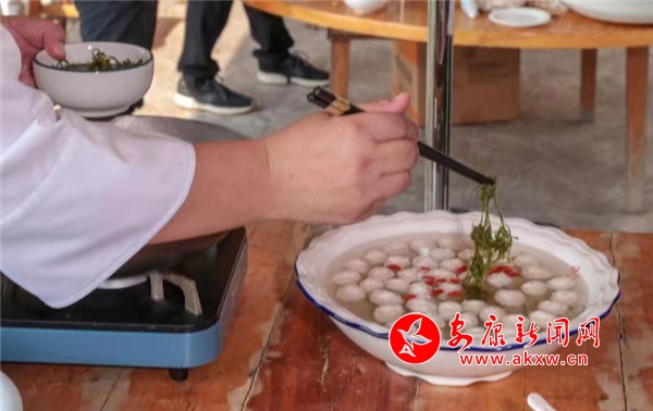 毛朝軍要研發(fā)的新菜品是“絞股藍汆魚丸”、“蓮蓬魚”。絞股藍是一種古老的中草藥和常飲茶,含有黃酮類、多種維生素、微量元素、礦物質(zhì)等。具有降血壓、降血脂、降血糖、延緩衰老等功效。是安康市特有的地域特色的保健產(chǎn)品。他研發(fā)的“絞股藍汆魚丸”的制作方法是選用上好的2公斤左右草魚洗凈晾干后去掉魚頭,用刀將魚肉刮掉后放入打肉機,加泡好的絞股藍水、少量鹽打至無顆粒感后的魚茸取出放入盆中加適量雞蛋清、蔥姜水等調(diào)料充分攪拌后做成直徑1.3公分左右的丸子放入溫水中慢熟后倒入盤中,再將泡過的絞股藍少量枝葉及10余粒枸杞子放入盤中。一道具有安康地域特色的“絞股藍汆魚丸”就做成了。該菜品的特點是自然爽口,回味甘醇,營養(yǎng)豐富。