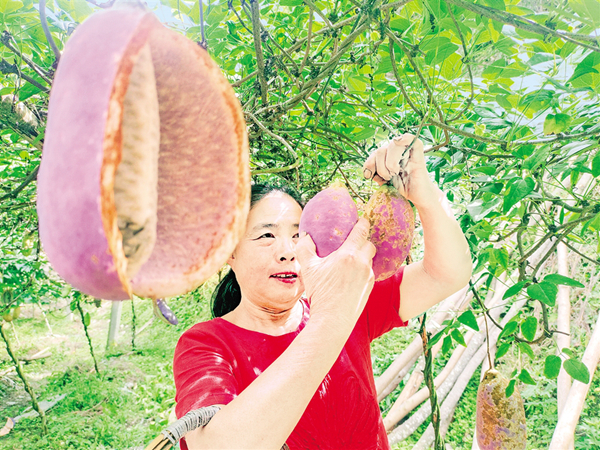 遠嫁安徽的漢濱區(qū)雙龍鎮(zhèn)謝坪村魏澤會,在外打拼一生,年逾花甲思鄉(xiāng)心切,于2018年回到家鄉(xiāng),在老家附近的一條山溝里,栽種了30畝八月炸。今年,八月炸喜獲豐收。走進園區(qū),一行行、一架架八月炸藤蔓,掛滿了粉紅的果實,有的裂開果肉,像極了開懷大笑的娃娃。魏澤會說:“今年產(chǎn)量達到3萬公斤左右,因八月炸不易保存,謝坪村第一書記汪道軒和陜西省生態(tài)廳環(huán)境信息中心駐村干部馬祥一起,先后通過網(wǎng)絡(luò)推介、電商促銷和臨時售賣點等幫我們銷售。”為了最大限度增收,魏澤會已嘗試利用八月炸釀酒、榨油等,均已成功,因產(chǎn)量很小,暫未對外銷售。erZ安康新聞網(wǎng)