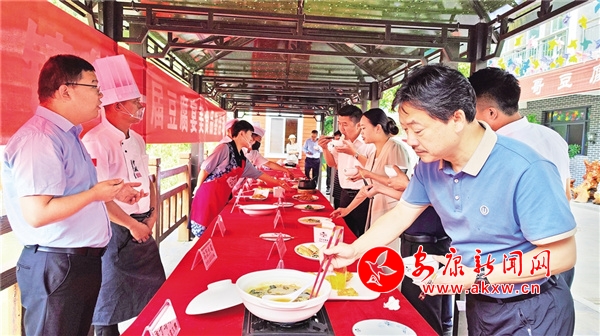 活動現(xiàn)場,壹品坊豆腐、王莽山莊、鄭家農(nóng)家樂、胡桃里農(nóng)莊、舒大嫂農(nóng)家樂、方氏豆腐坊、財哥豆腐宴等10家農(nóng)家樂帶來的37個美味的菜品一一呈上長條桌,供現(xiàn)場參與人員品鑒。