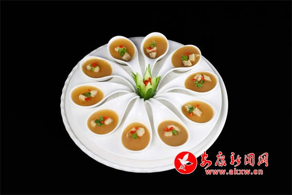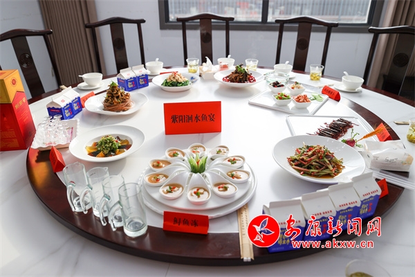 “紫陽(yáng)洄水魚(yú)宴”由8個(gè)涼菜,即:香酥小魚(yú)、干煸牛肉、茶香魚(yú)皮、鱘魚(yú)凍、撈汁七彩花生、酸辣四拼、雙色變蛋、涼拌折耳根;8個(gè)熱菜即:茶香鱘魚(yú)、紫蘇魚(yú)片、熗鍋鯉魚(yú)、釀羊肚菌、辣子雞、臘味三拼、魚(yú)頭燉黑豆腐、當(dāng)歸白蘿卜燉羊肉;一個(gè)湯菜:魚(yú)丸湯;3道小吃即:魚(yú)肉餃子、茶香餅、紫菜魚(yú)餅;主食:金銀米飯、酸菜面和飯后水果拼盤(pán)組成。(通訊員 李勝璋)