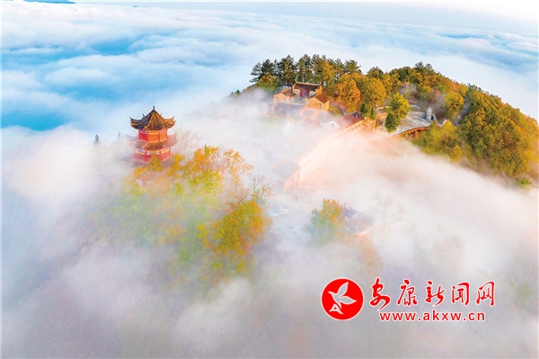 天柱山最美不過秋色,也是我在四季當(dāng)中頻繁上山的季節(jié)。每逢秋天,這里紅黃綠相間,漫山掛彩,在藍(lán)天的映襯下,多了幾分浪漫。從國道211起點的兩條上山公路,由數(shù)個“之”字連接起來,從湖邊一直盤旋至山頂?shù)陌自乒潘,遠(yuǎn)眺仿佛一個大大的“人”字形飄帶。雨后放晴的頭兩個早晨,在云霧的籠罩下,天柱山的下半身連同湖面一并被巨大的“蠶絲被”覆蓋,山的上半身或山頭浮在云海之上,像是茫茫大海上的一座孤島。