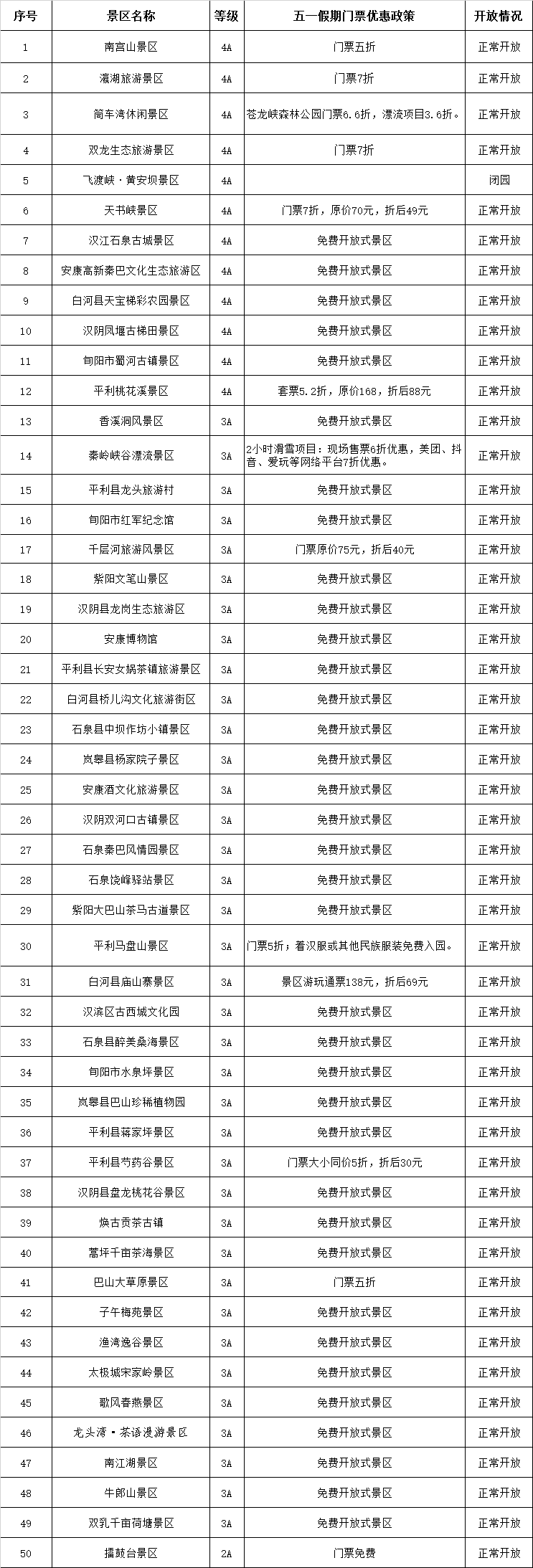 安康市2024年“五一”假日A級(jí)旅游景區(qū)門票優(yōu)惠及開放情況
