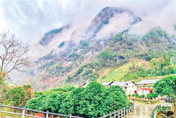 推開(kāi)房門,晨霧尚未散盡,細(xì)雨斜斜地織著。老人們常說(shuō)“有雨山戴帽,無(wú)雨半山腰”,這話在此時(shí)格外應(yīng)景——裊裊云霧沉甸甸地壓住遠(yuǎn)處的峰頂,像給每座山頭都戴了一頂灰絨帽子,讓群山失去了往日的險(xiǎn)峻,只留下青灰色的輪廓,恍若一幅優(yōu)美的寫意水墨畫。等到午后雨勢(shì)稍小,云霧退到半山腰,卻始終戀著大山不肯消散。隨著一陣陣微風(fēng)拂起,那些云霧像被吹落的玉帶,在墨綠的樹(shù)林間織出半透明的簾幕。