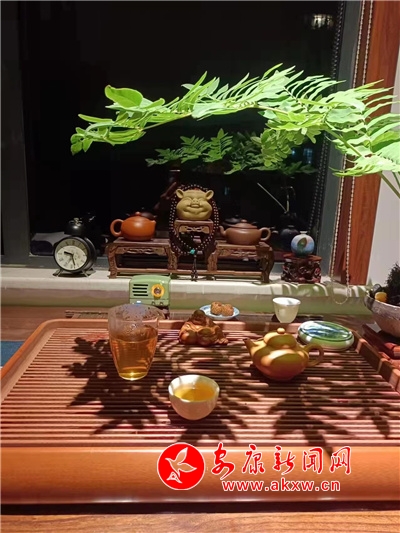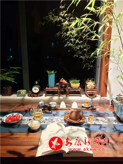 次日,我便聯(lián)系他,欲欣賞一下他的書房陳設(shè),他欣然允之,發(fā)了書房的照片。但見潔凈的白色窗臺上擺放著清秀的文竹、蔥綠的石菖蒲、一尊笑容可掬的彌勒佛、精巧小豬擺件上系著一串佛珠,雞翅木書桌上擺放著古樸典雅的茶具旁擺置一株紫竹。彼時,許是他正品著香茗,展卷而讀,然后進入一個縱橫千萬里,上下幾千年的世界。徐徐夏風,紫竹搖曳,竹影映射于書,似也愜意。