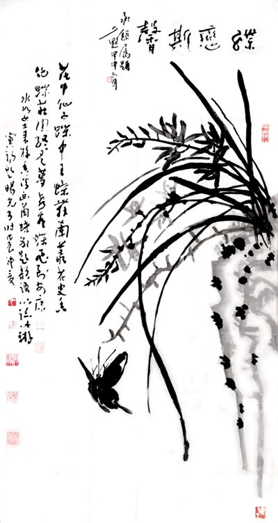 1988年,中國畫壇號稱“蝶王”的王冰如女士,以80歲高齡回到她曾工作生活10年之久的第二故鄉(xiāng)安康舉辦畫展,并且以詩書畫會友,特邀旸光先生和金州著名詩人劉寅初老人同游香溪,冰如老師興之所至,巧繪墨蝶,說道“人言寅初老弟有曹子健七步成詩之才,今日以十步為限,將此畫為題,賦詩一首,旸光老弟書于其上如何?”寅初老只走了三步便道有了,于是順口吟誦,旸光先生揮毫急就“花中仙子蝶中王,蝶舞籣叢花更香,化蝶莊周終是夢,喜看蝶王飛安康。”一筆流暢的行草躍然于畫上,相輔相成,真是詩情畫意天作之合。一幅難遇難得難覓的“三絕圖”誕生了。冰如老師感慨萬千,說到“二位弟臺才高八斗,只可惜待在安康這個貧瘠的地方被埋沒了也!”這個場面是一種巧合,正是旸光先生“萬事隨緣”的結晶,爾后經書壇大家陳少默先生為之題跋做款,更是錦上添花,成了四絕圖。冰如、少默、旸光、寅初先生已然作古,這段翰墨丹青之情,將永存世間傳為藝術佳話。