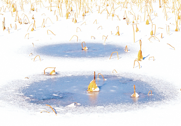 我的攝影創(chuàng)作圍繞生命的痕跡、時(shí)間的隱喻兩個(gè)主題。在《嘉實(shí)擷芳·野圃瑤音》中,菜園的微觀生態(tài)被賦予交響樂般的節(jié)奏——葫蘆藤的螺旋曲線是生命的律動(dòng),西紅柿根莖的垂直排列是生長的秩序,蚜蟲蝕痕的細(xì)節(jié)則暗喻生態(tài)的共生與抗?fàn)。而在《澄漪棹?middot;沙月溯光》里,榮成海岸的冬夏對(duì)比成為時(shí)間的隱喻,結(jié)冰湖面上的凋敗蓮蓬是流逝凝固的時(shí)光,夏日海邊的金色水洼則是流動(dòng)的永恒。我癡迷于捕捉這種矛盾與共生——就像用冷暖色調(diào)碰撞出畫面的張力,也用虛實(shí)構(gòu)圖處理每一張照片,期待每一張照片是個(gè)性鮮明,讓人耳目一新。3J3安康新聞網(wǎng)
